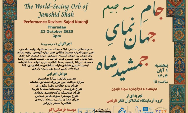 پرفورمنس حرکتی، مشارکتی و آیینی سه جیم ویژه کودکان و نوجوانان با نام جام جهاننمای جمشیدشاه، روایتی از جمشید شاهنامه فردوسی با رویکرد جهانگردی و بازآفرینی برخی آیینهای کشورهای عضو اکو شامل: ایران، افغانستان، آذربایجان، قزاقستان، قرقیزستان، پاکستان، تاجیکستان، ترکیه، ترکمنستان و ازبکستان، تجربهای از آزمایشگاه تماشاگران تئاتر نارنجی با همکاری کرسی ترویج علم یونسکو، بنیاد فردوسی، انجمن ترویج علم ایران، مؤسسه فرهنگی فردوسی توسی و پایگاه خبری شاهنامهنیوز با حضور هنرمندان برجسته و مدیران ارشد فرهنگی به میزبانی مؤسسه فرهنگی اکو در تهران، پنجشنبه یکم آبان ماه ۱۴۰۴ ساعت ۱۵ به روی صحنه میرود.